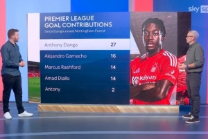 伊兰加2023年夏天从曼联转会诺丁汉森林,转会费1750万欧元,天空体育指出,伊兰加转会以来在英超参与27粒进球,同期加纳乔参与16球,拉什福德、阿玛德-迪亚洛各参与14球,安东尼参与2球。