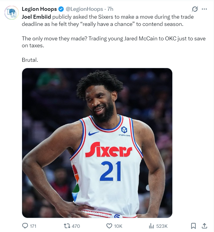 赛前根据费城记者的报道,恩比德希望球队在交易截止日前采取行动,因为他认为球队在本赛季有希望展开竞争。可球队唯一的运作是将麦凯恩送到雷霆节省奢侈税,这太残酷了。